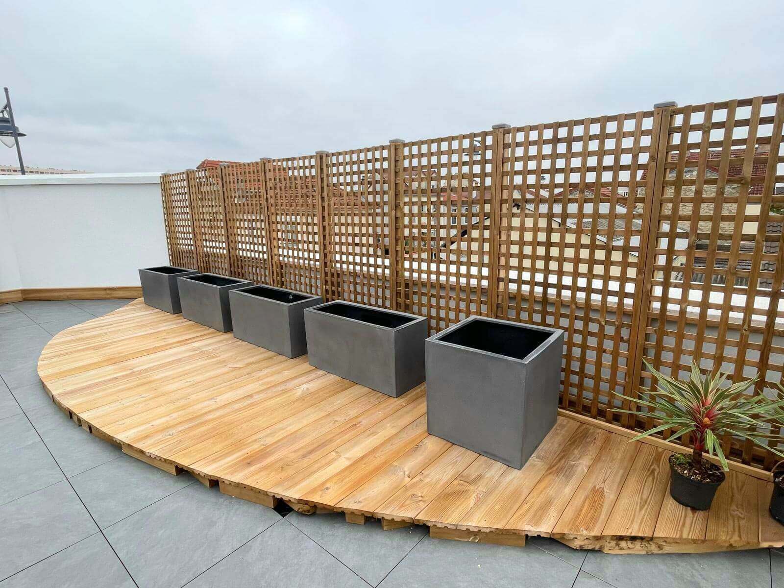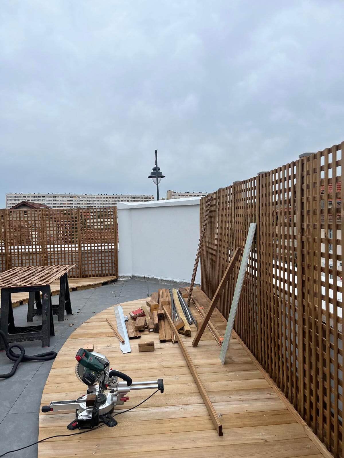 Les menuisiers installent le sol bois sur plots et lambourdes et les dalles cérames sur plots en jouant sur les hauteurs de pose. L’objectif est de créer une différence de niveau entre le sol bois et le cheminement en dalles cérame. Ensuite ils effectuent les découpes courbes pour marquer le cheminement sinueux recherché. C’est un vrai travail de précision ! L’occultation des vis-à-vis est réalisée grâce à la pose des treillis bois à maille carrée.